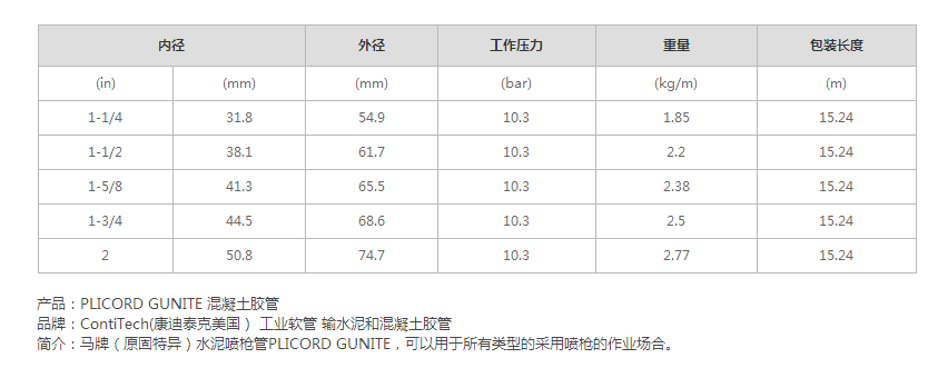 用于罐車作業或廠內作業,輸送干性的,非油型的大宗食品物料。技術參數內層:經過FDA認證,白色Pureten天然橡膠增強層:多層螺旋纏繞的合成纖維,帶兩條鍍鋅金屬螺旋絲外層:灰色Versigard?合成橡膠(波狀表面)/橙色商標帶(環裹壓印)工作溫度:-25°F到180°F(-32°C到82°C)適用標準